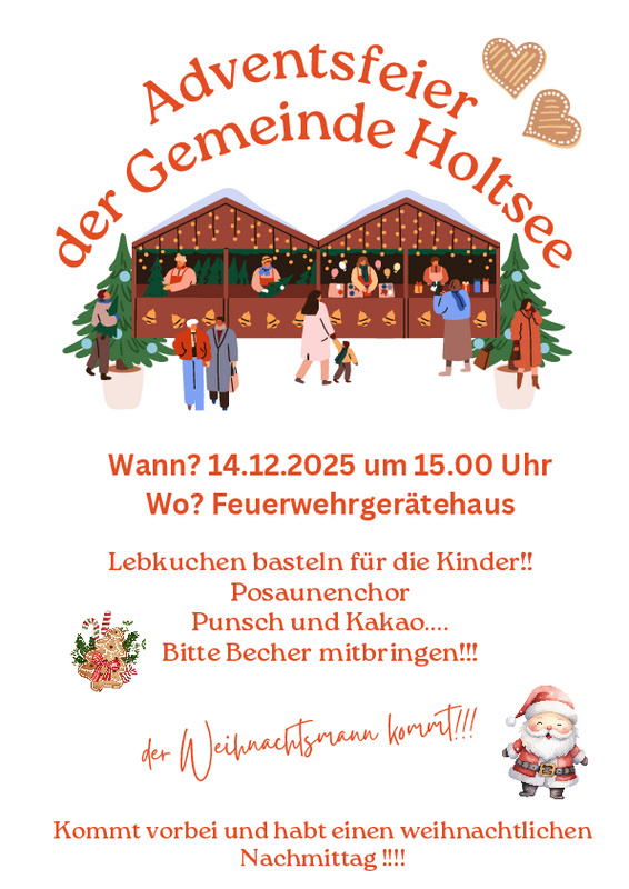 Am 3. Advent findet die alljährliche Adventsfeier der Gemeinde am Feuerwehrgerätehaus statt. Ab 15 Uhr gibt es Punsch, Kakao, Grillwurst und, und, und … der Weihnachtsmann kommt!