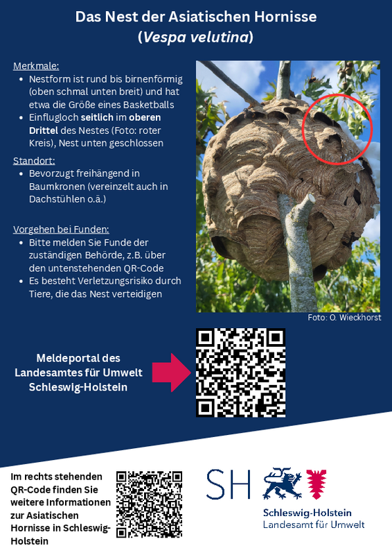 Nester sollen über das Meldeportal des Landes Schleswig-Holstein gemeldet werden: https://lfu-sh.meldeportal.cloud/observation/4e6d43cc/asiatische-hornisse