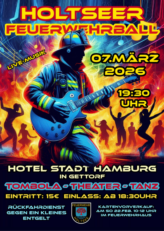 Die Freiwillige Feuerwehr Holtsee lädt zu ihrem jährlichen Feuerwehrball in das Hotel Stadt Hamburg in Gettorf ein. Gestartet wird um 19:30 Uhr (Einlass ab 18:30 Uhr) mit einem niederdeutschen Theaterstück.
