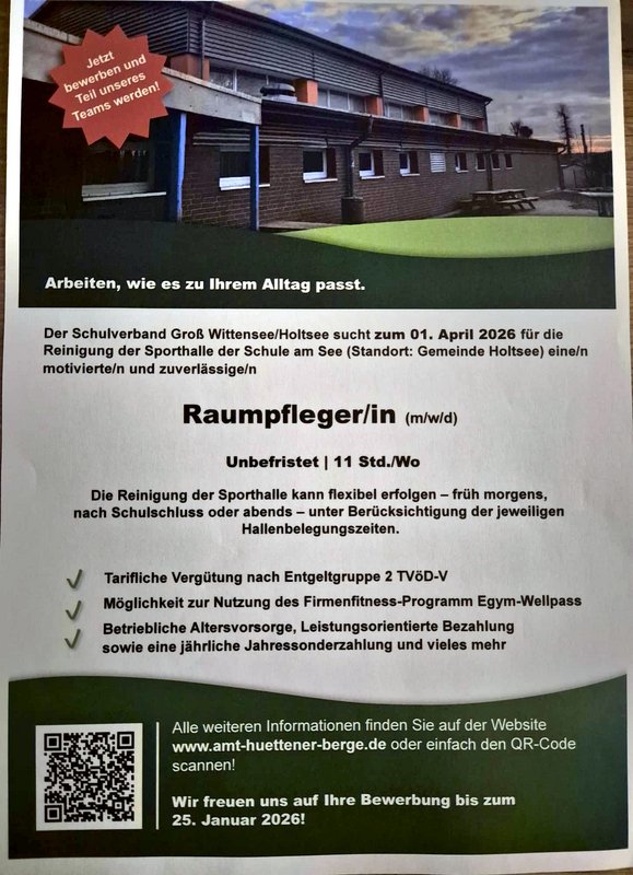 Der Schulverband Groß Wittensee/Holtsee sucht zum 1. April eine/n Raumpfleger/in (m/w/d) für die Reinigung der Sporthalle in Holtsee. Die Stelle ist unbefristet und umfasst eine Arbeitszeit von 11 Stunden pro Woche. Die Reinigung kann flexibel erfolgen – früh morgens, nach Schulschluss oder abends – jedoch müssen die Hallenbelegungszeiten Berücksichtigung finden.