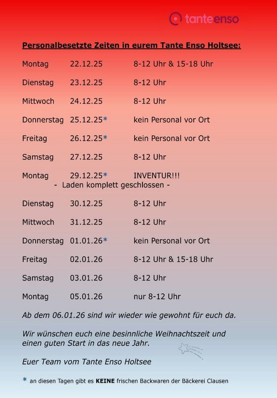 Am 25. und 26. Dezember gibt es ebenso wie am 1. Januar keine frischen Backwaren. Das gleiche gilt für den 29. Dezember, da der Laden wegen der Inventur komplett geschlossen ist.