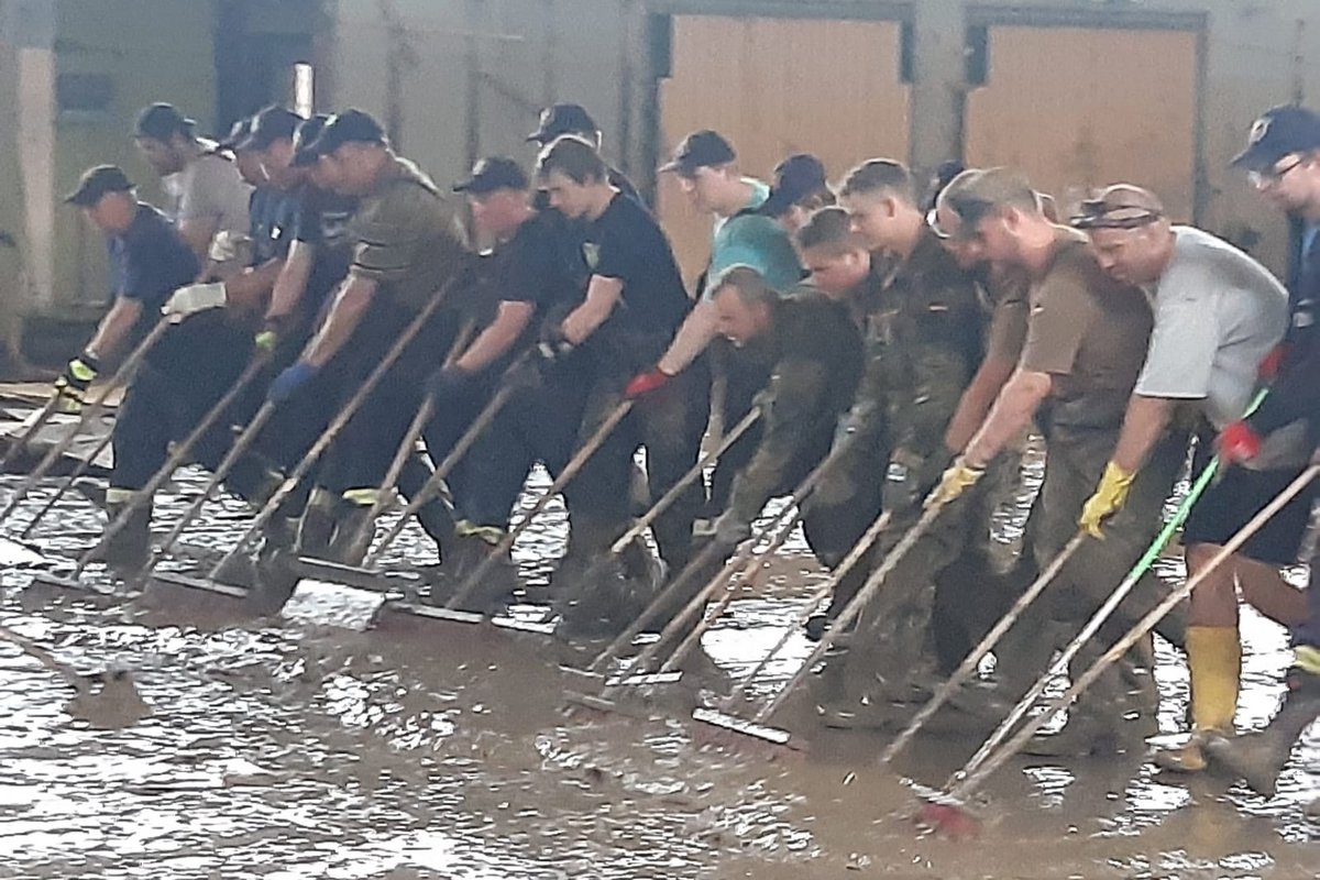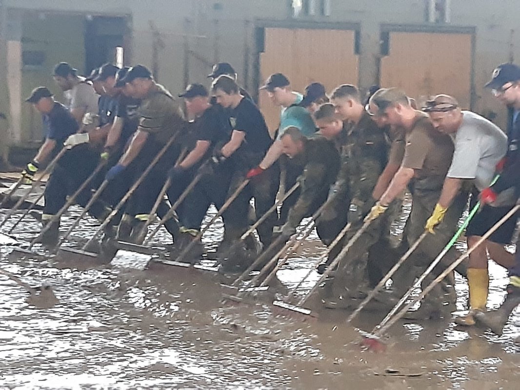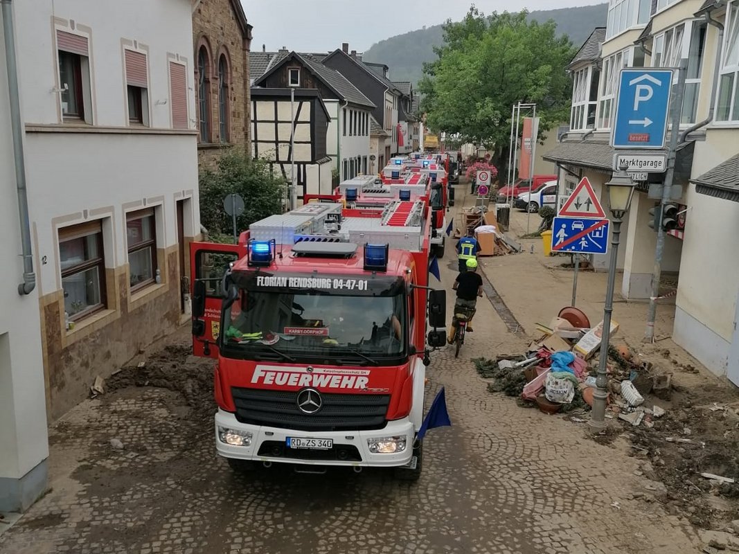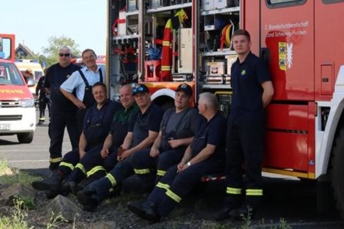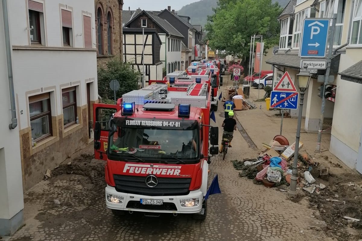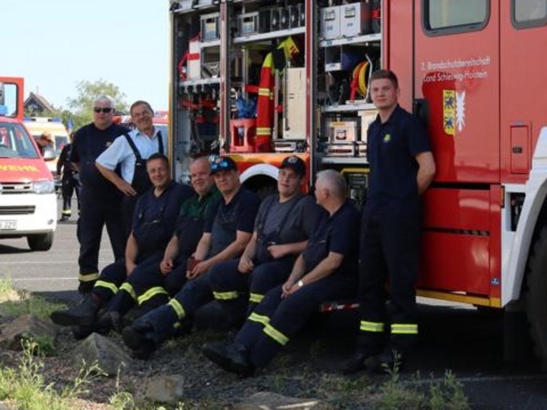 Am 20. Juli wurden diverse Feuerwehr-Einsatzkräfte aus Schleswig-Holstein zum Einsatz in das Katastrophengebiet in Nordrhein-Westphalen und Rheinland-Pfalz in Marsch gesetzt, darunter auch das LF KatS‑SH aus Holtsee. Wehrführer Kai-Uwe Haß machte sich um 14 Uhr mit den acht Kameraden Leon Becker, Linus Erichsen, Oliver Hein, Sönke Koberg, Rolf Krabbenhöft, Michael Möller, Olaf Suhr und Martin Thormählen mit dem vor einem Jahr erhaltenen Fahrzeug auf den Weg nach Büdelsdorf, wo sie sich mit dem Rest der 2. Brandschutzbereitschaft des Landes Schleswig-Holstein traf, deren andere Einsatzkräfte ebenfalls aus dem Kreis Rendsburg-Eckernförde kommen.