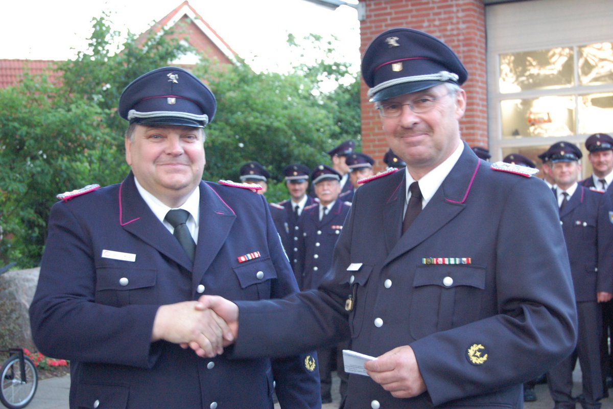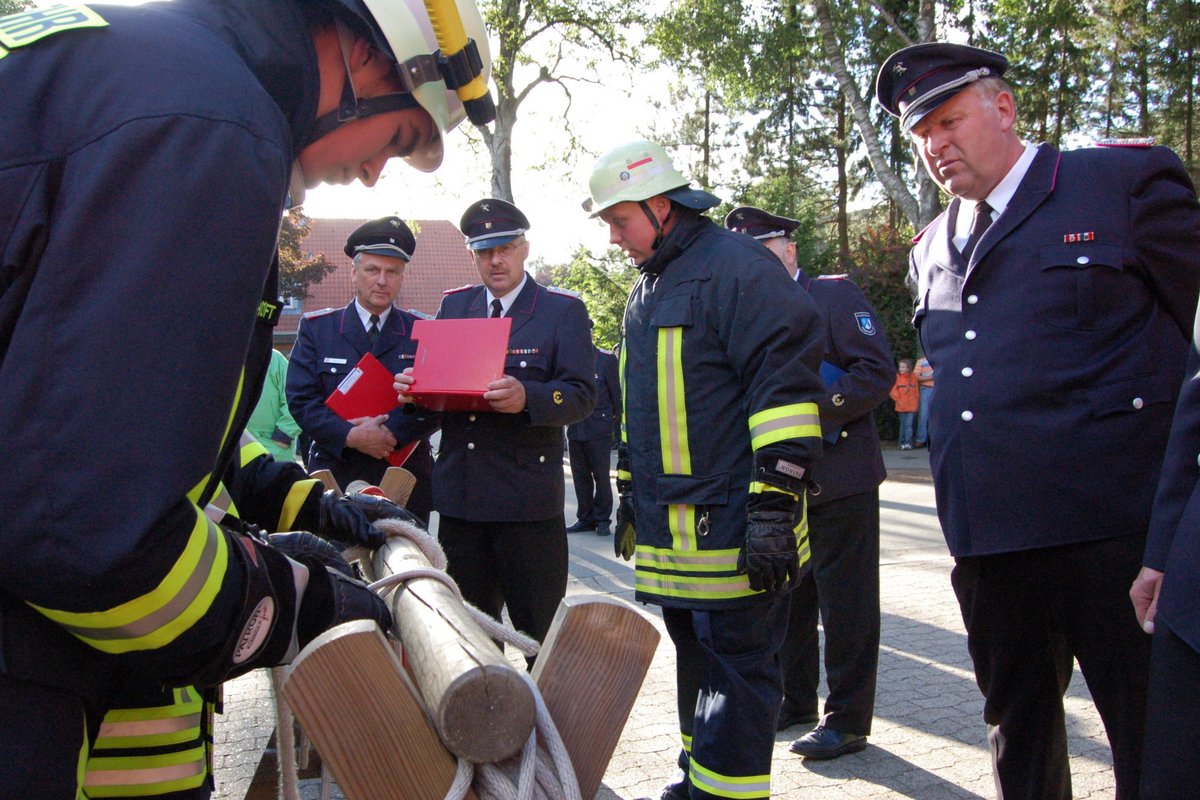 Gegen 21:30 Uhr zog die Wehr wieder die Ausgehuniform an und trat zur „Urteilsverkündung“ erneut vor dem Gerätehaus an. Kommissionsleiter Lothar Jöns, der Wehrführer der FF Loose ist und am nächsten Tag mit seiner Wehr selber die Stufe 1 der Leistungsbewertung durchführt, zeigte sich beeindruckt von der Leistungsfähigkeit der Holtseer Feuerwehr, auch wenn man das eine oder andere immer noch verbessern kann, und er wäre hoch zufrieden, wenn seine Wehr ein ähnlich gutes Ergebnis erzielen würde. Er beglückwünschte nicht nur die Wehr zu ihrem dritten Stern, sondern auch den Bürgermeister, die zahlreichen Gemeindevertreter und Bürger zu ihrer Feuerwehr. Schließlich überbrachte Karl-Heinz Lappöhn, Mitglied des Vorstands des Kreisfeuerwehrverbandes, die Glückwünsche der Kreiswehrführung und überreichte Wehrführer Heinrich Möller die Urkunde.