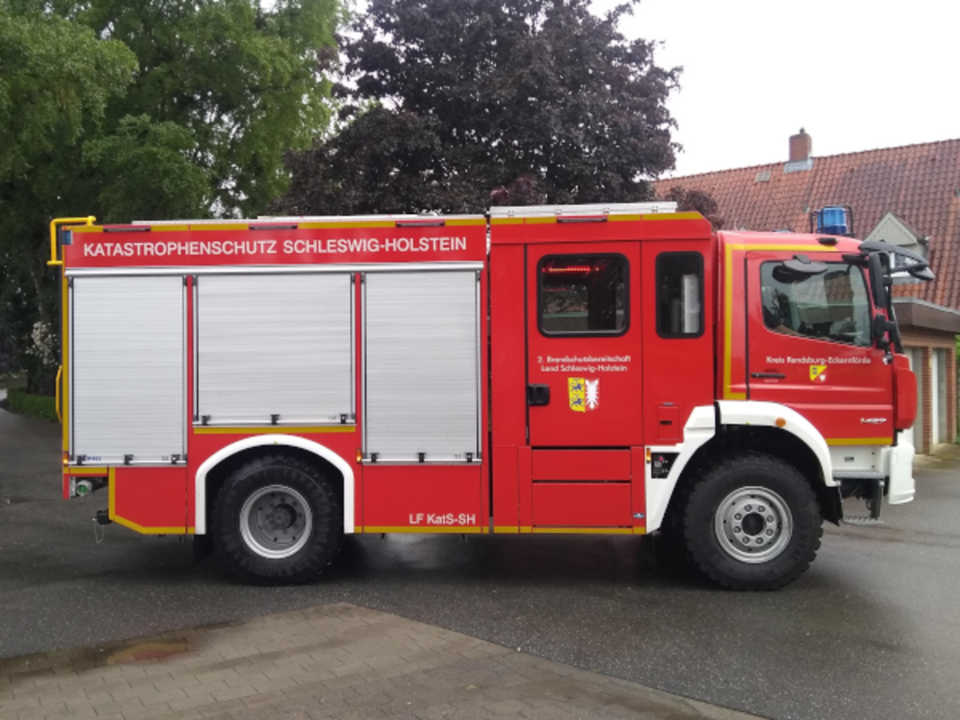Am Mittwoch erfolgte eine ausführliche Einweisung sowie die Übergabe, der durch das Land Schleswig-Holstein beschafften Fahrzeuge an die Wehren, die sie in ihren jeweiligen Standorten unterstellen und bei Bedarf mit Personal bestücken. Heute Morgen ging es dann ganz früh mit diesem Fahrzeug, das das 35 Jahre alte LF 16‑TS ersetzen wird, wieder nach Hause