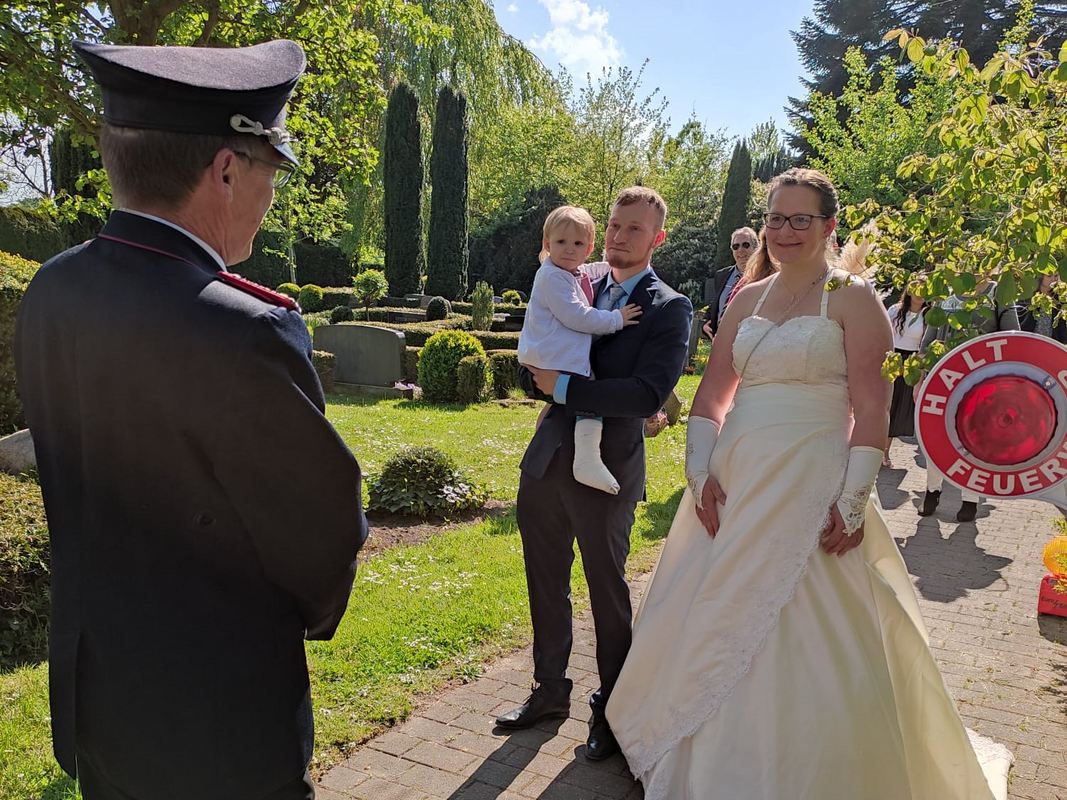 Mit einer Abordnung gratulierten wir Timo und Janina Ströh zur kirchlichen Trauung. Nachdem das Brautpaar ein Spalier aus Strahlrohren, Äxten, Schaufeln und weiteren Feuerwehrgerätschaften durchschritten hatte, mussten die beiden je einen Golfball duch einen Feuerwehrschlauch befördern. Der Sieger – den wir hier nicht verraten wollen – soll in der Ehe das Sagen haben, schlug Wehrführer Kai-Uwe Haß vor. Auch von dieser Stelle aus nochmals die herzlichsten Glückwünsche und alles Gute für die Zukunft.